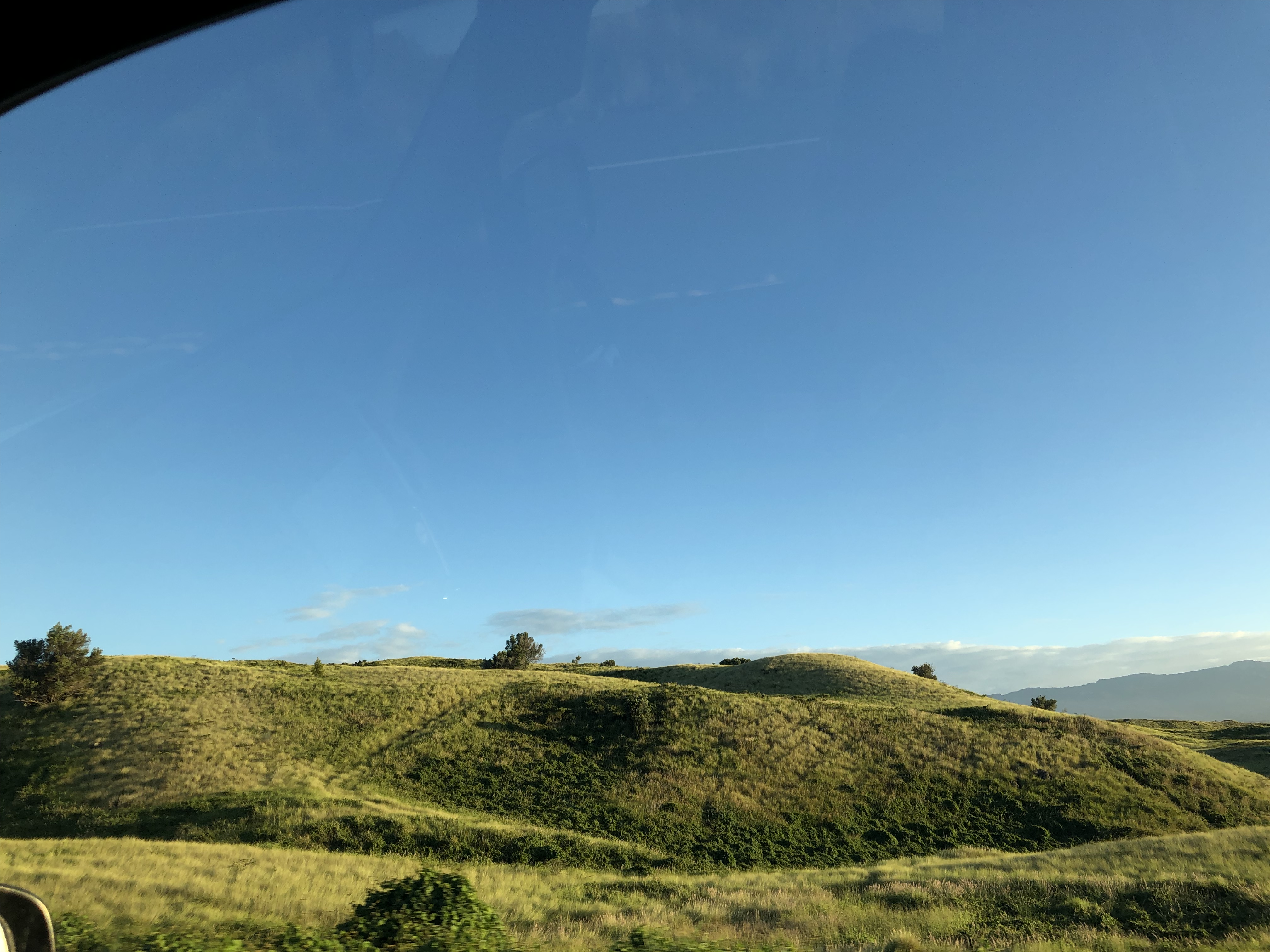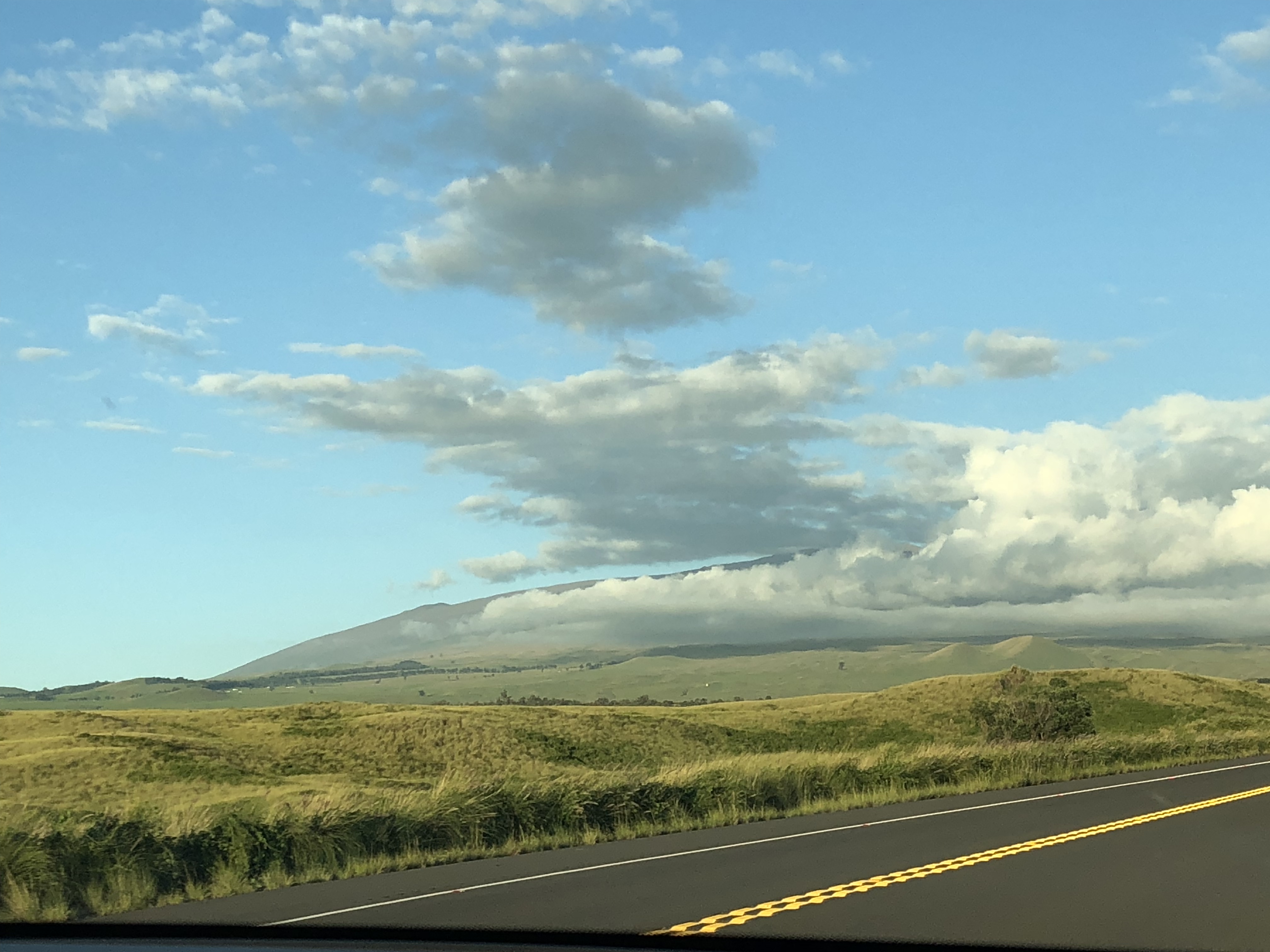 Volcanoes National Park is a 2 hour drive from Kona airport, going east completely from one side of the island to the other. As I drive, it’s nice to have cruise control for once and I notice that the elevation goes up; your ears are constantly popping. The streets and roads can go from steep to flat pretty quickly. At one point, a sign says we are at 2590 feet elevation, and if you touch the window, it’s cold! But you get great views like this: