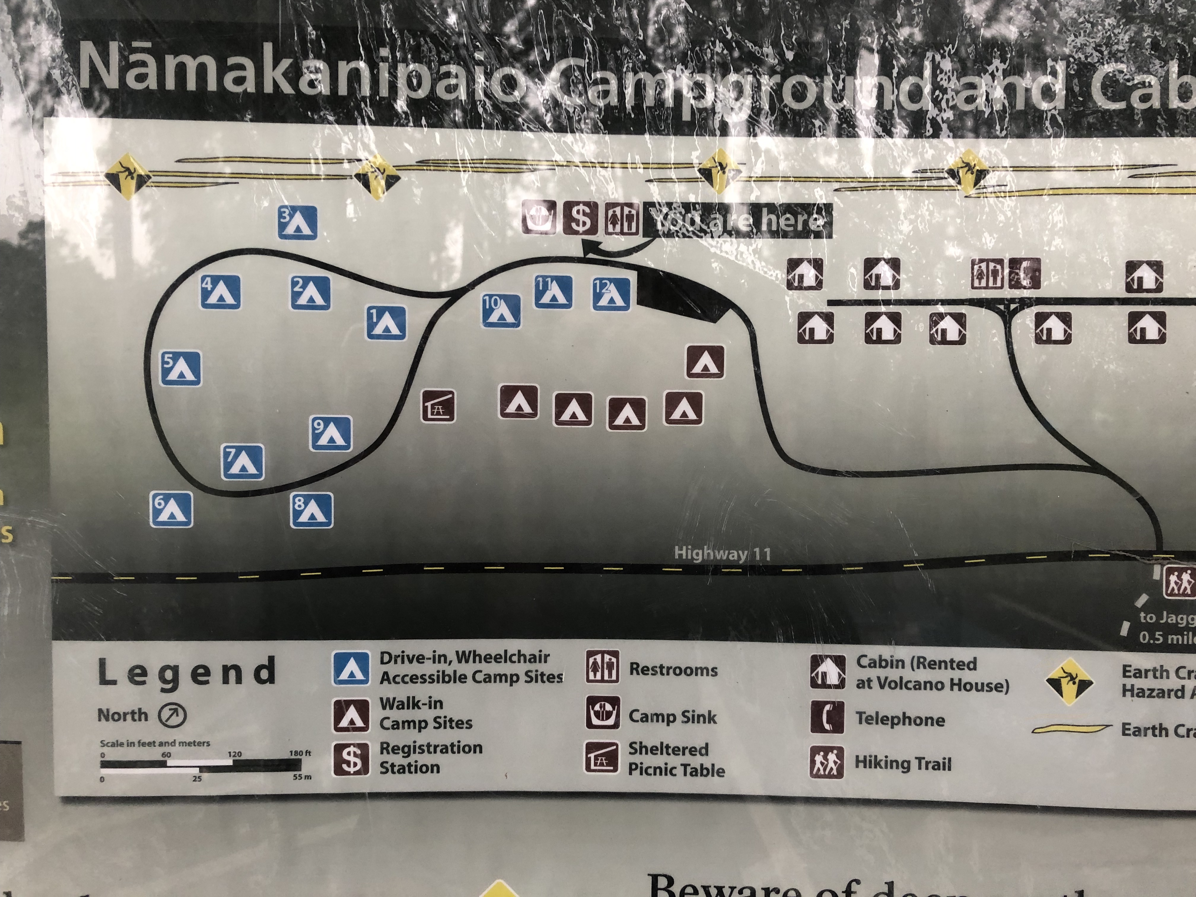 It gets dark early here; the sun sets around 7 PM. Now it’s about 830 PM, and we make it to the Park, where it’s very dark and our elevation is now 3000 feet. I get to the campsite, Nāmakanipaio, where it’s first com, first serve for drive-in camping, and get the last open spot. Yay! There’s no envelopes to self pay, so I call the Volcano Hotel, which is actually in the park and the lady on the line gives me the number to reserve the spot over the phone with my credit card: so easy! The park employee then drives over and had me sign the paperwork and the spot is mine for the next 2 nights.