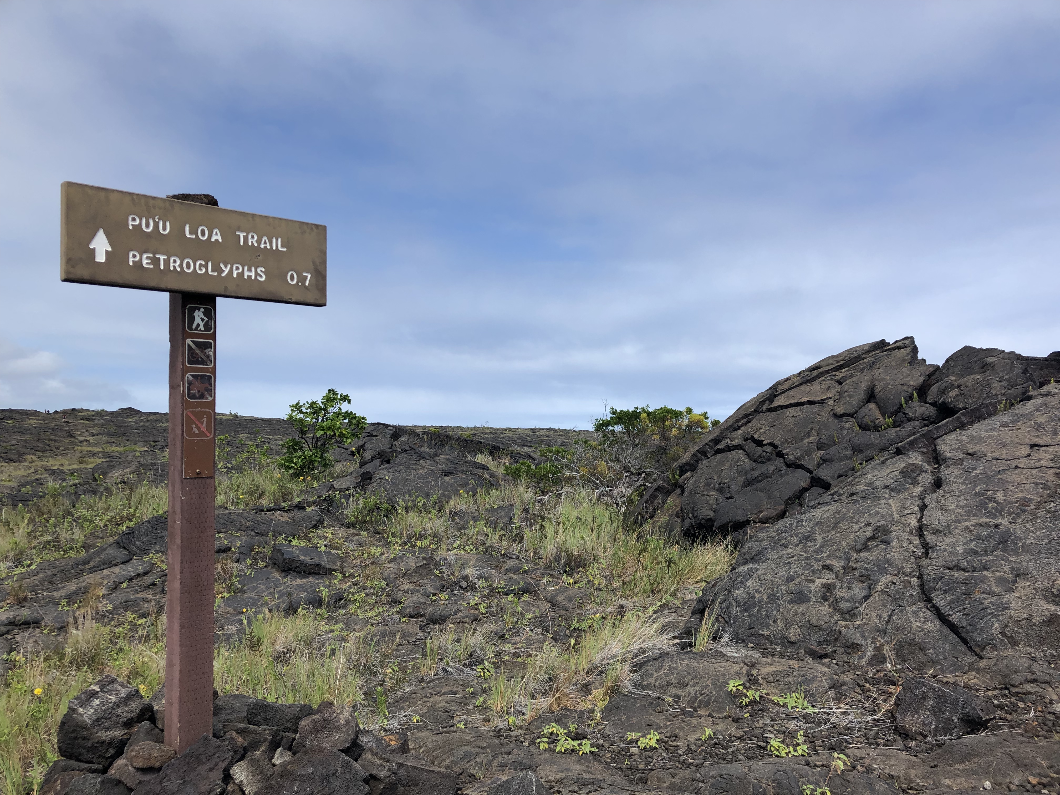 You walk about 1.5 miles total round trip on the lava itself to a boardwalk to see the carvings. It’s a rough walk on uneven footing, so be prepared. I didn’t see how people were walking on flip flops on this rock. Unlike some of the other hikes, there’s no shade out here. It’s reminiscent of a desert hike but with wind from the nearby ocean.