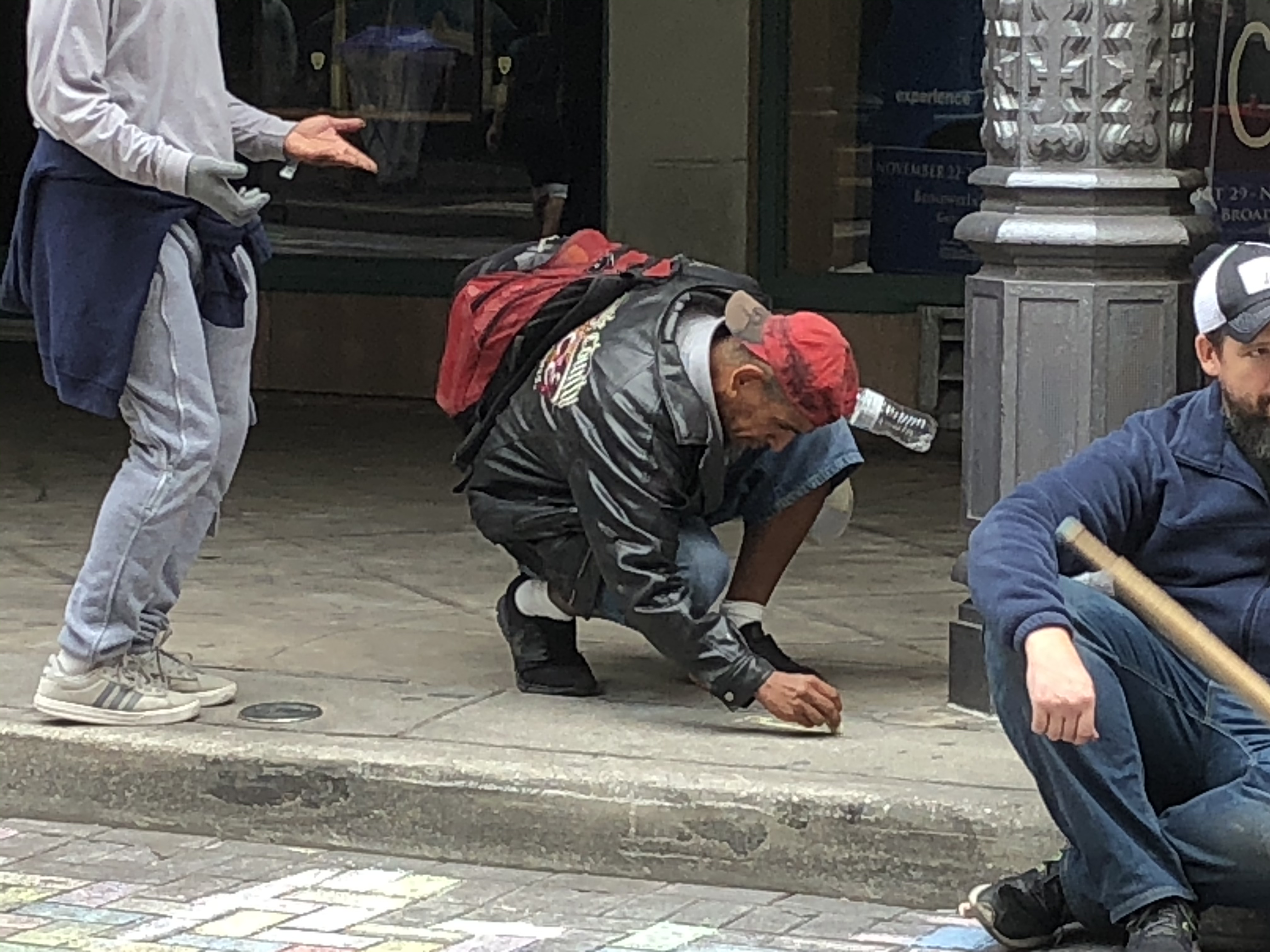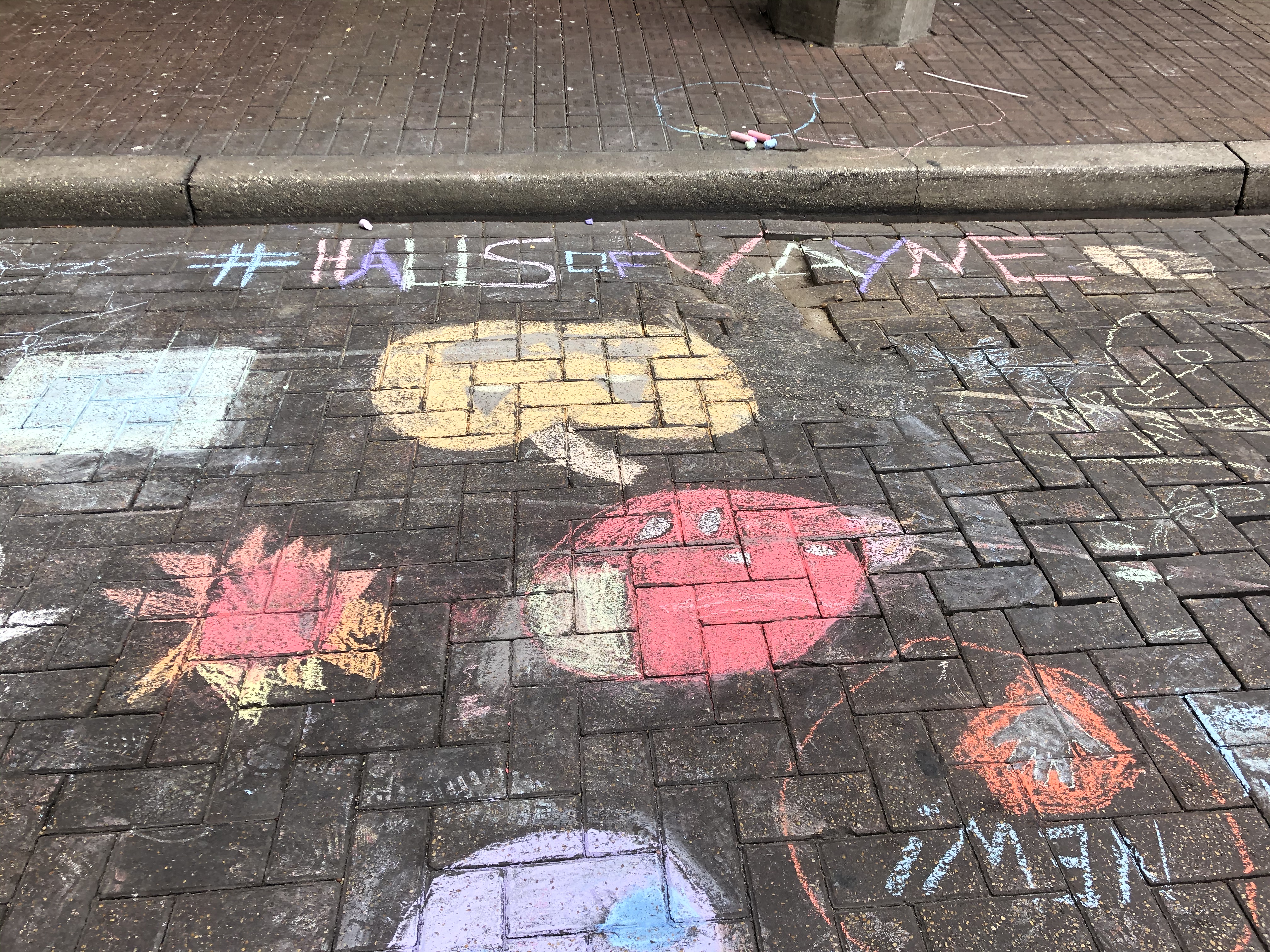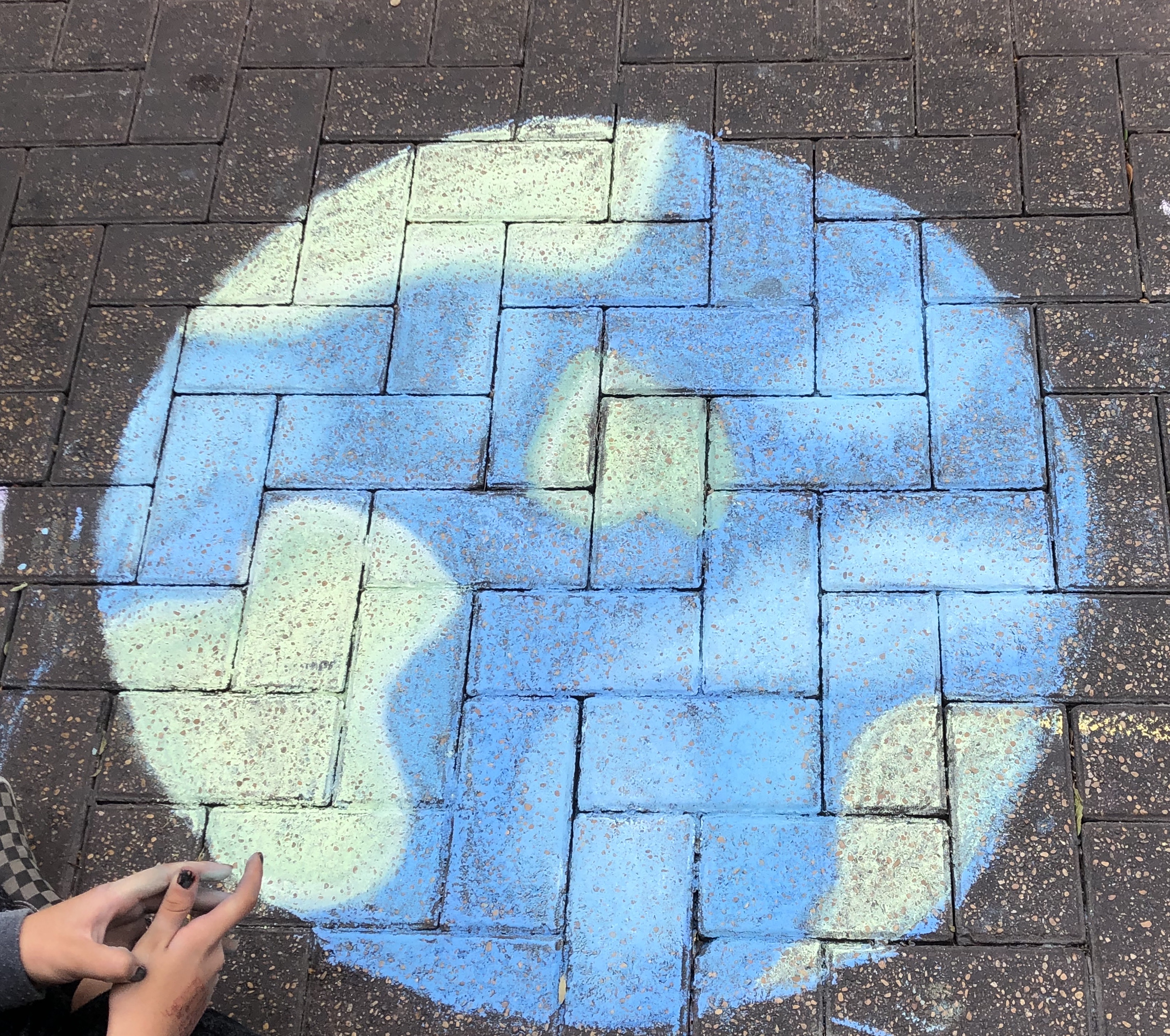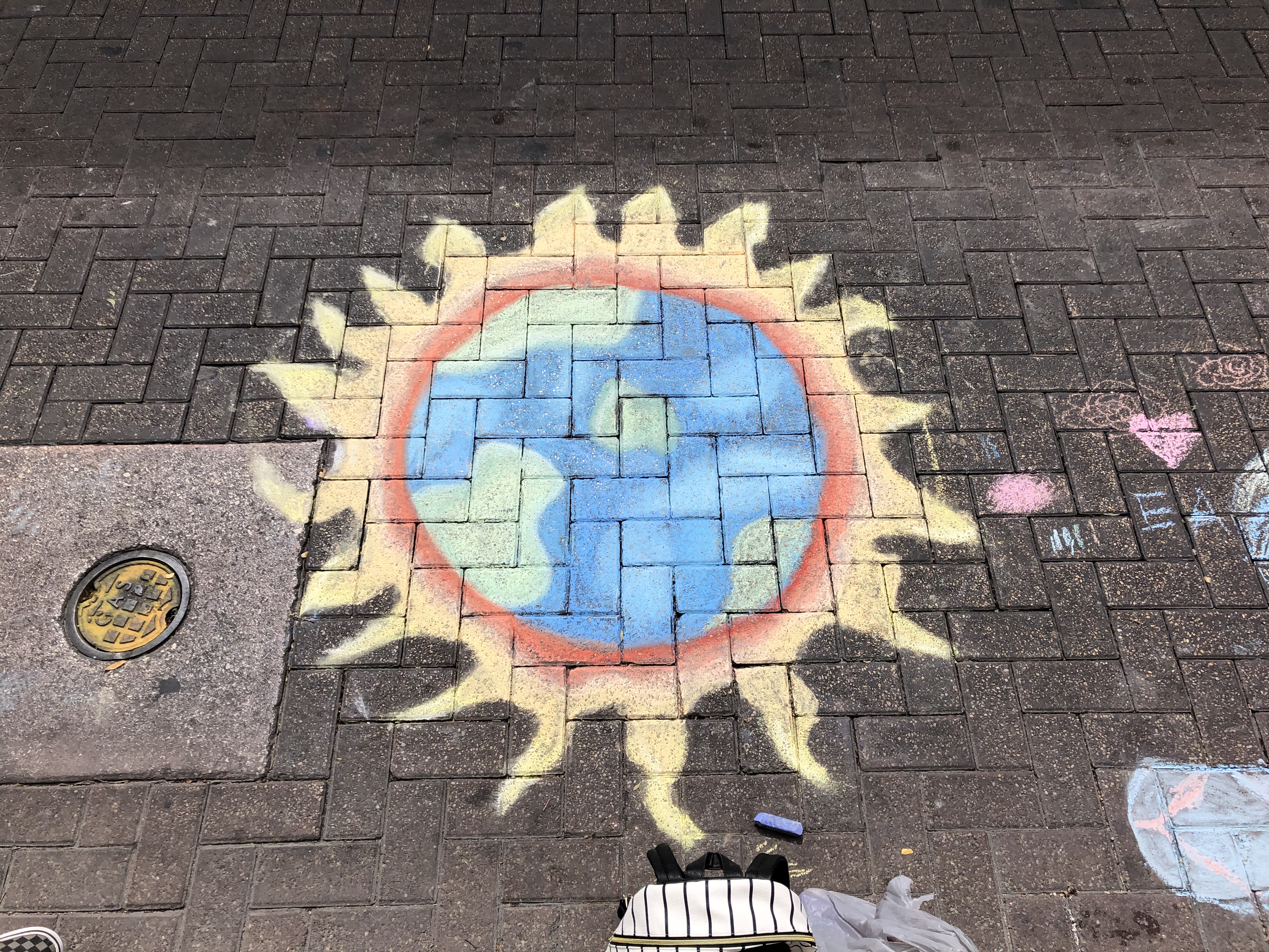 Now that our bellies were full, it was time to hit the streets to play! As this is not my first time coming, I brought my own chalk and pastels. Pro-tip: the best one to buy is the Crayola 48 in a box chalk with a squared off shape so they don’t roll away from you!
