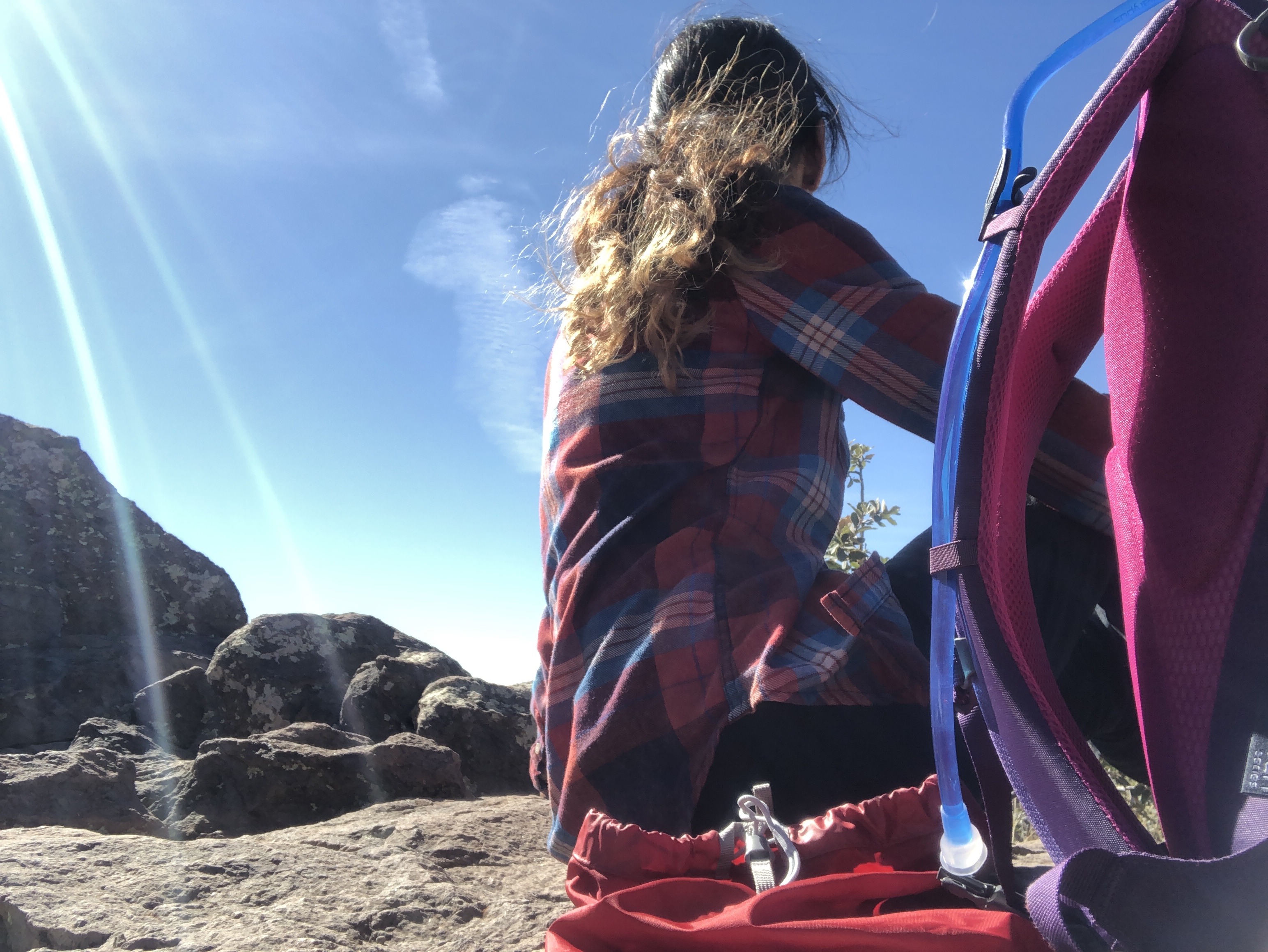 I talked to a guy wearing a Channel Islands T-shirt who told me his tale of taking the boat there to Santa Cruz Island and how fun it was. After taking in a snack of beef jerky (my traditional favorite when I hike), it was time to descend. It was much easier coming down. I also got compliments on my Snoopy attached to my backpack. 🙂