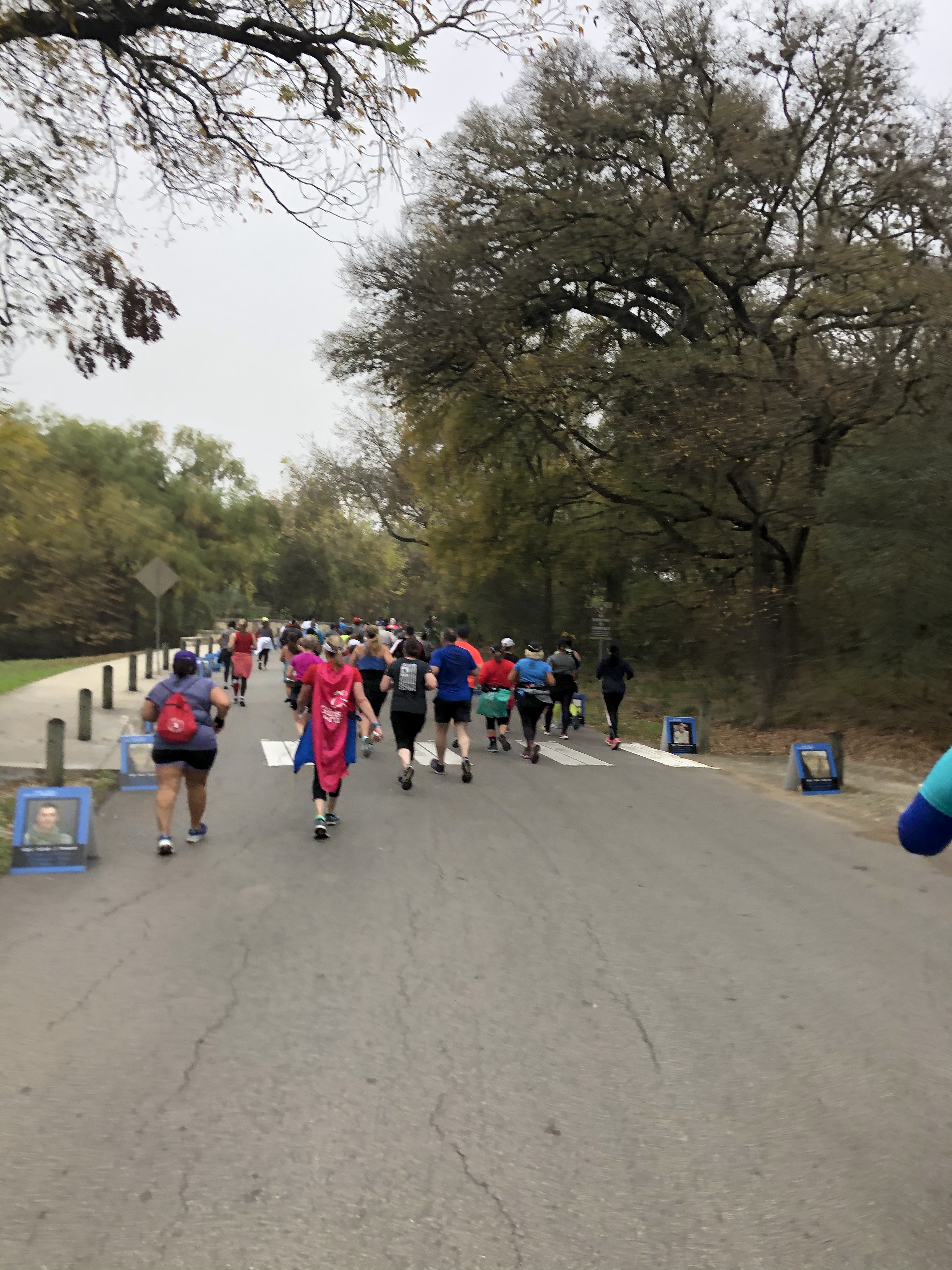 Ugh, the side stitch pain on my side, nooo! I make my way through Brackenridge Park and my toes are finally not numb anymore so I feel a little more confident. In the park, the run took us through a path lined with flags and the photos of soldiers who lost their lives serving our country. It was sad and beautiful and after all the photos were soldiers holding flags cheering you on. You could’ve help but salute and hi-five them.