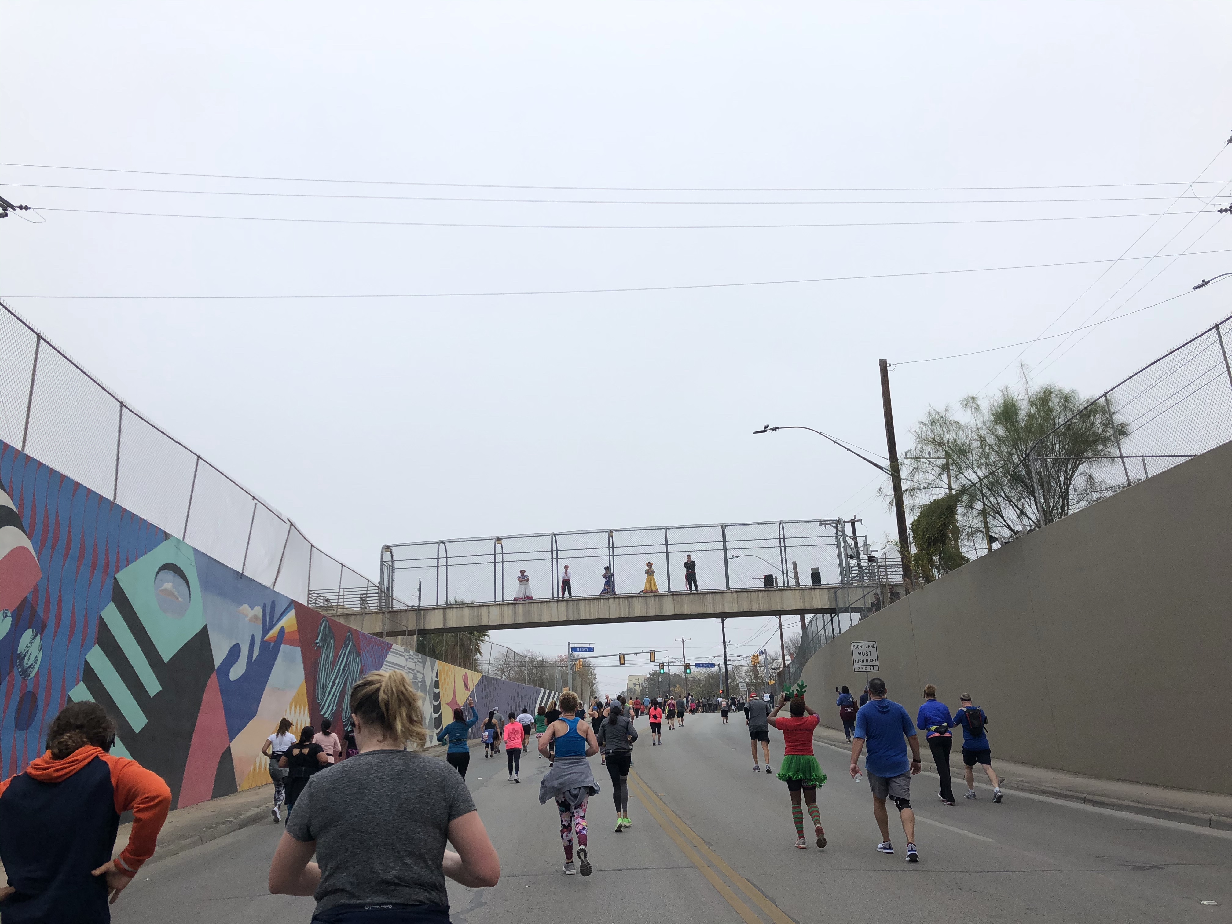 Around this mark the marathon runners split from to do the full route and the half marathon runners go back towards downtown towards the finish line. On an overpass pedestrian bridge are dancers and music cheering runners on. Ladies dressed in their Sunday best come out of churches encouraging the runners to finish, and I start to believe I can do it!
