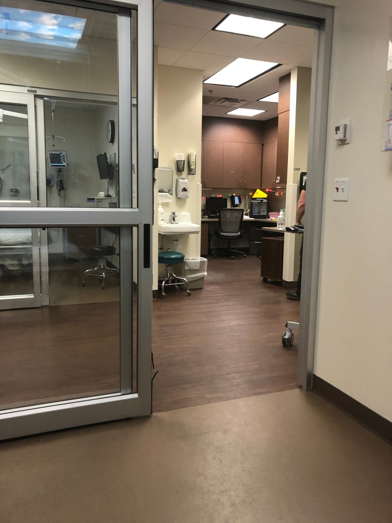 I can barely stand at this point and I check in and tell them I believe I have the flu. I only waited a few minutes when I get my vitals done, which is in a space right behind the check in window. The nurse hands me a face mask right away and starts taking my vitals. He tells us that his brother lives near San Antonio, in La Vernia. I croak out that it’s farm land and he says everything is farm land in Texas.