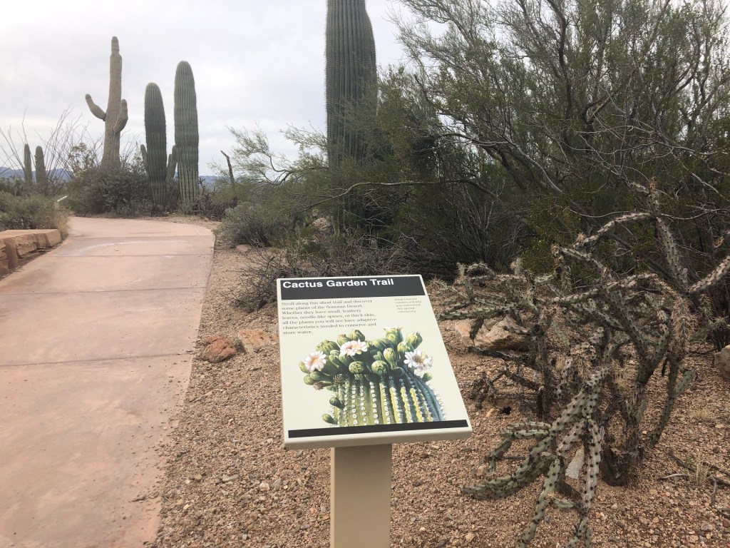 A small path behind the center takes you on a tour of erosion wash and the desert scenery. We marveled at how immense the cacti can get, and how they look like people with arms!