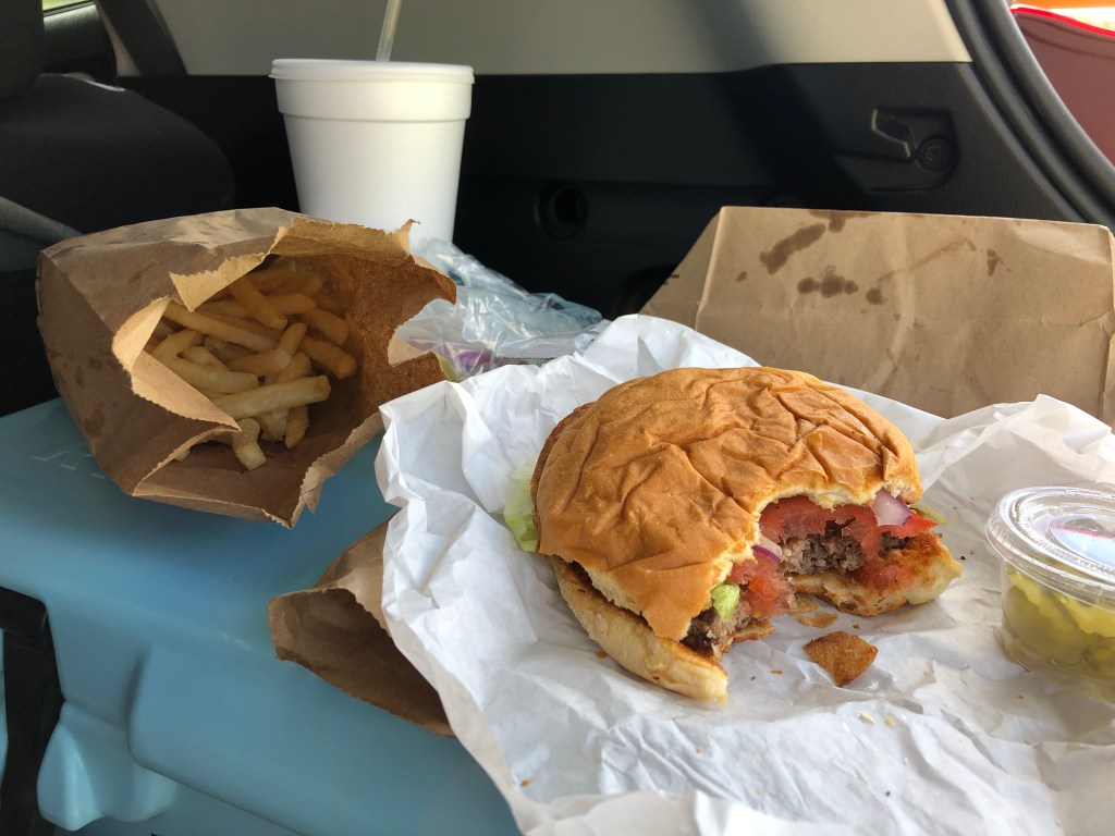 The drive was long and I’m starving. So I stop at the Trading Post next to the campsite and grab their homemade burger and fries and nice cold coke before relaxing and catching up on a book I’ve been reading on my Kindle app. I also get a chance to sketch the landscape I can view from the back of my car camp setup.